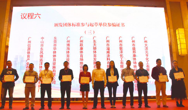 2020年11月24日,廣州市質量強市工作領導小組辦公室牽頭舉行的運動場地合成材料面層產品質量提升工作成果暨團體標準發布會在番禺美麗豪酒店召開。廣東省體育設施制造商協會承辦,廣州博海體育設施有限公司等企業代表出席了大會。